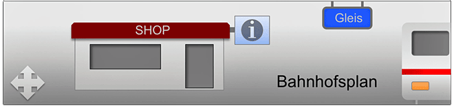 Der Bahnhofsplan in Detailansicht mit Informationen zum Service, Einkaufen, Gastronomie, zahlreichen Dienstleistungen, WLan, Wege zum Umsteigen, Toiletten, Behinderten-Service und Schließfächer.